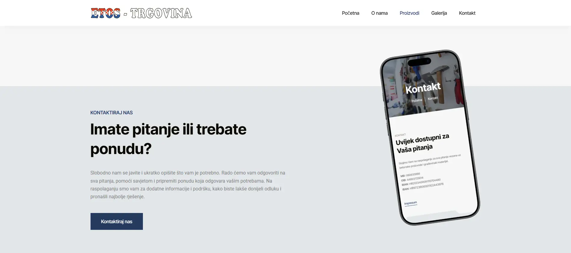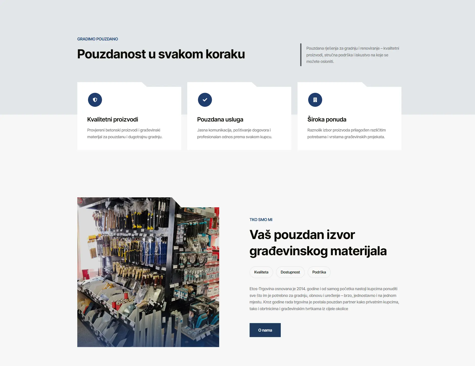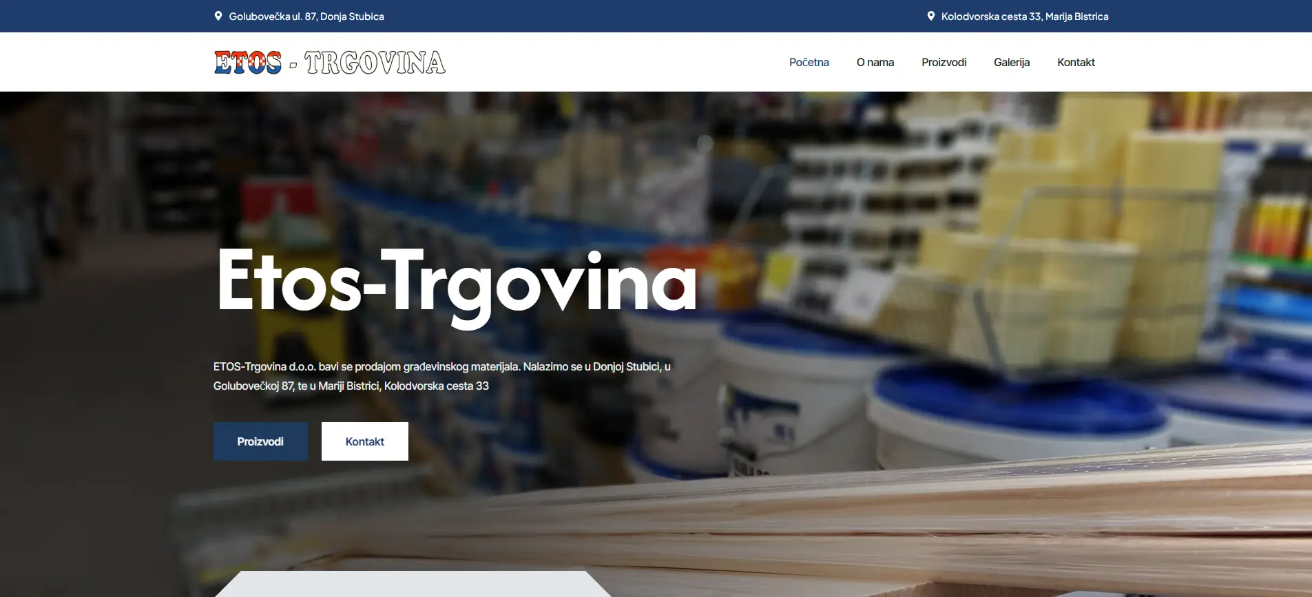 Projekt izrade web stranice za ETOS Trgovinu započeo je s ciljem stvaranja jasne i moderne online prezentacije tvrtke koja će kupcima omogućiti jednostavan pregled ponude i brži pristup informacijama. ETOS Trgovina bavi se prodajom građevinskog materijala te posluje na području Donje Stubice i Marije Bistrice, gdje kupcima nudi proizvode i rješenja za gradnju i renoviranje.